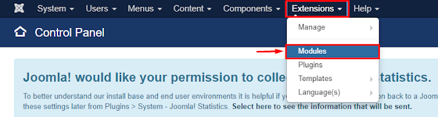 Masuk ke administrator Joomla. Lalu pilih menu Extensions, lalu Modules.